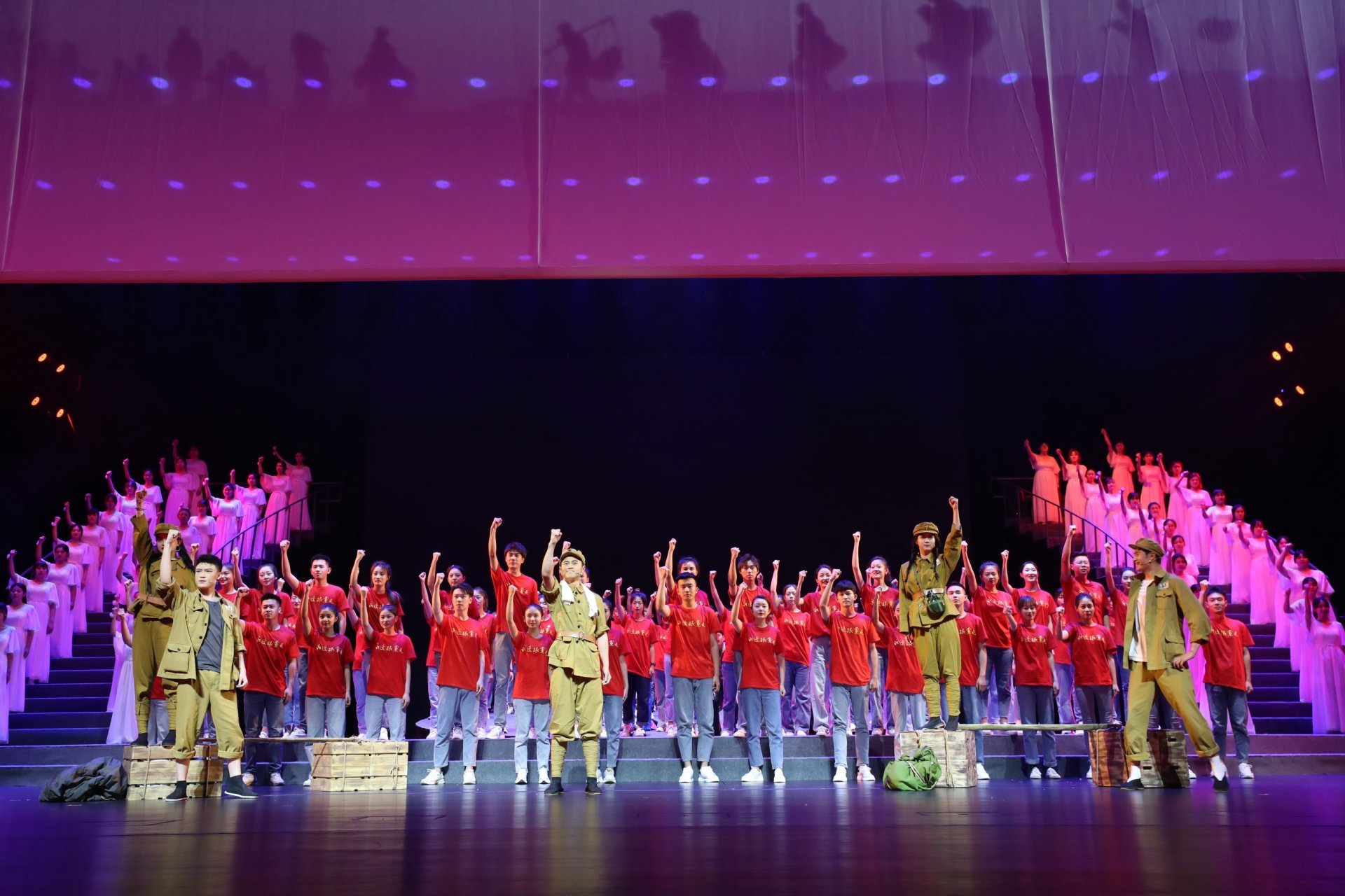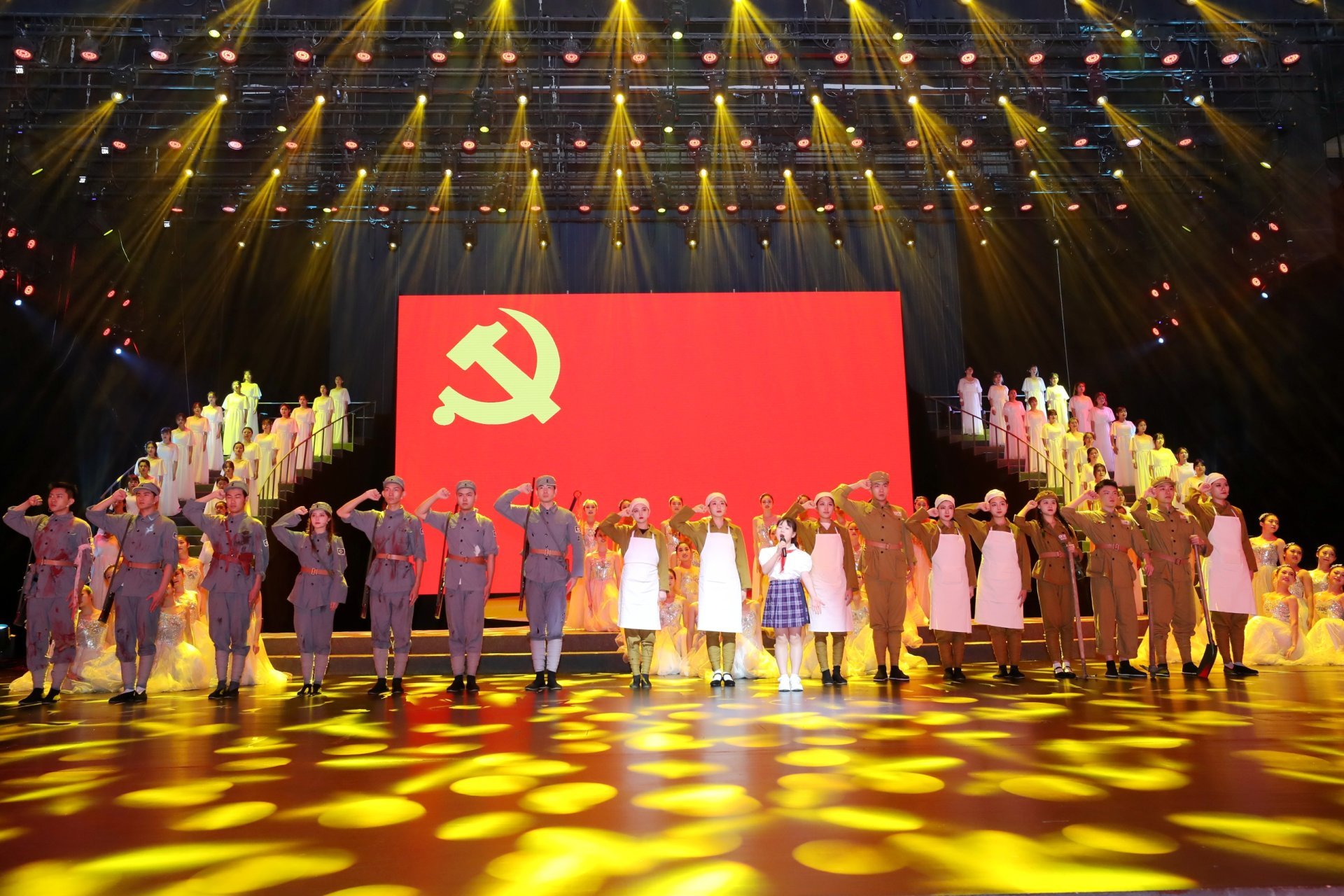 演出即將結束時,全體人員合唱《沒有共產(chǎn)黨就沒有新中國》,唱出了共產(chǎn)黨人奮進新時代、再創(chuàng)新輝煌的壯志豪情。在鏗鏘有力的旋律聲中,與會領導走上舞臺和演職人員合影留念。