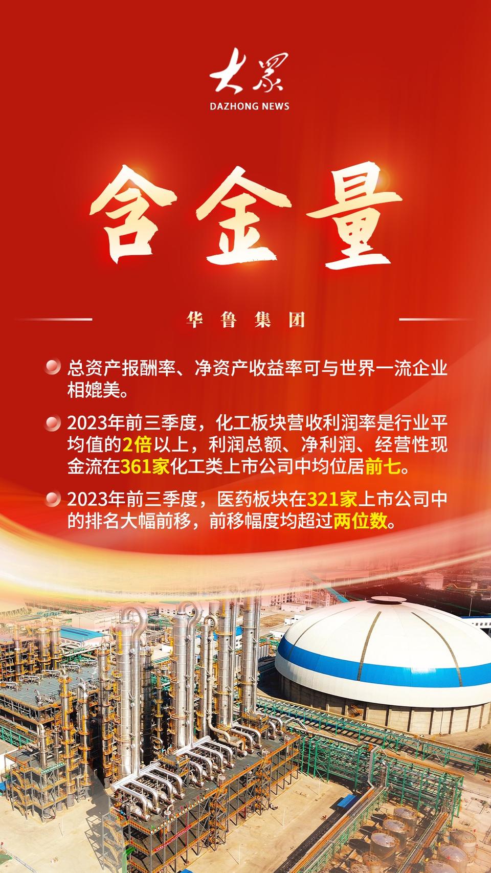 2023年,在新一輪國(guó)企改革深化提升行動(dòng)的開(kāi)局之年,華魯集團(tuán)交出了一份亮麗的“答卷”。轉(zhuǎn)型發(fā)展提檔加速,“兩新”收入、利潤(rùn)占比超過(guò)50%;創(chuàng)新成果創(chuàng)歷史紀(jì)錄,新產(chǎn)品成為新的增長(zhǎng)亮點(diǎn);總資產(chǎn)報(bào)酬率、凈資產(chǎn)收益率可與世界一流企業(yè)相媲美,行業(yè)排位大幅提升……