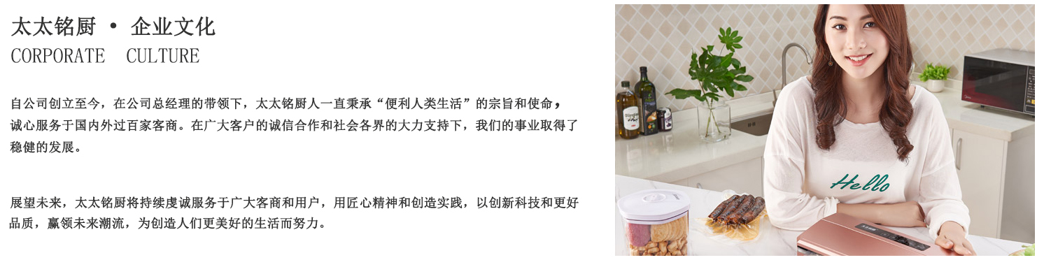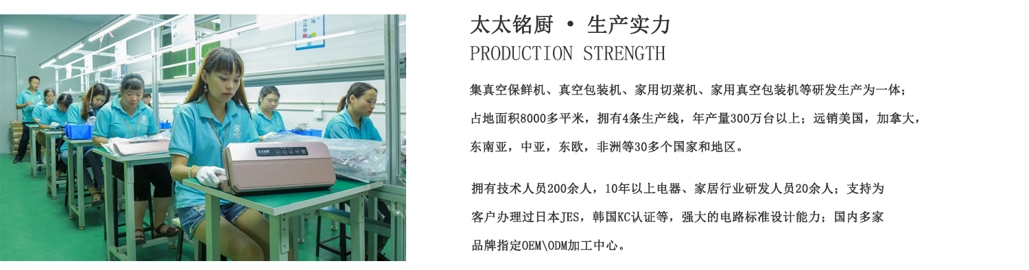 太太銘廚是廣東恒晟控股集團旗下家電品牌,是一家集研發(fā)、生產(chǎn)、銷售于一體的綜合性企業(yè)。工廠位于東莞市常平鎮(zhèn),廠房面積8000多平方米, 現(xiàn)有職工200多人,專業(yè)技術人員23人。專注于研發(fā)、制造家用真空包裝機,切菜機等廚房智能電器,為全球品牌家電廠家OEM及定制服務,為廚房家電用戶提供更好產(chǎn)品。產(chǎn)品遠銷銷售于歐美、巴西、日本、俄羅斯及東南亞等國家地區(qū)。